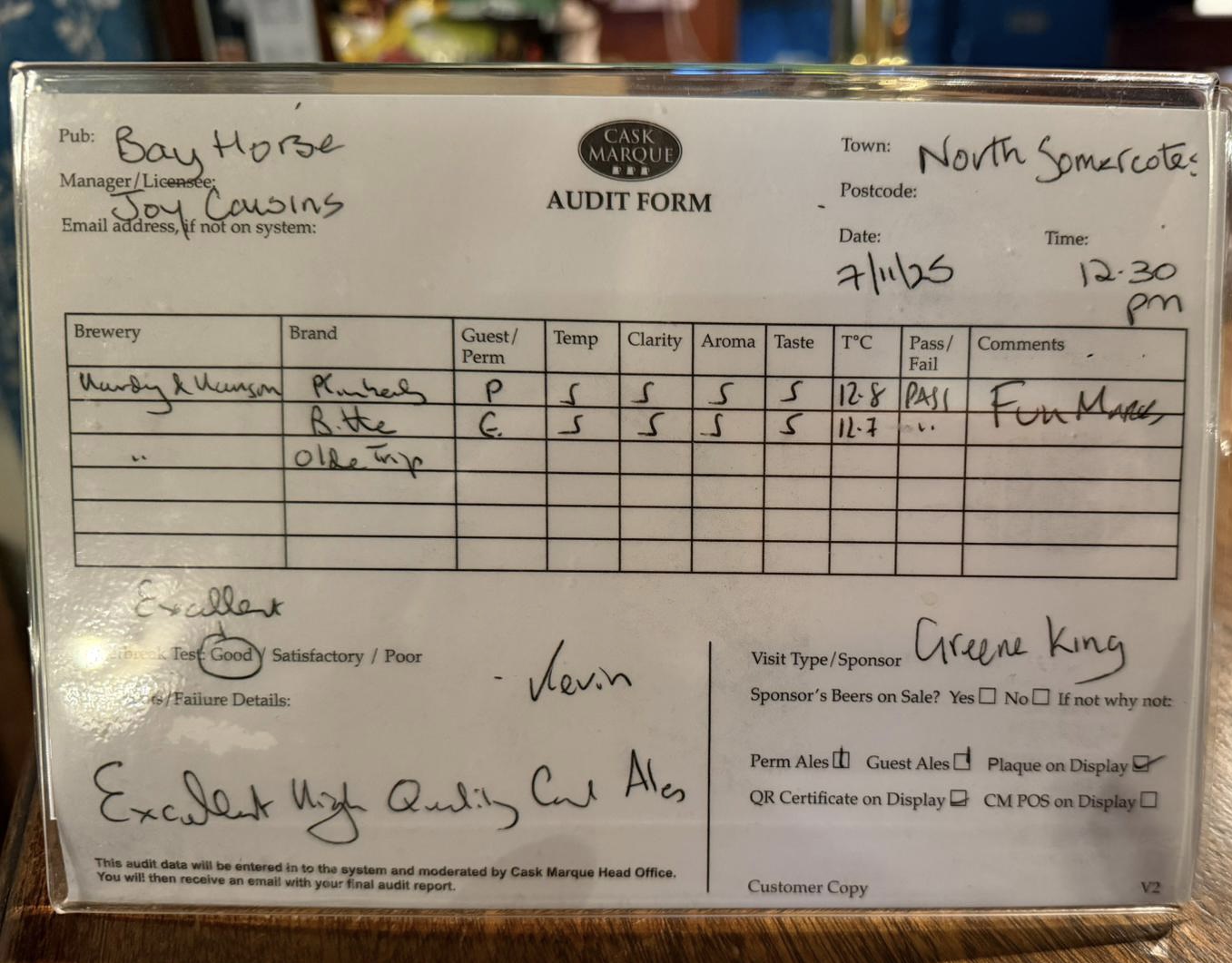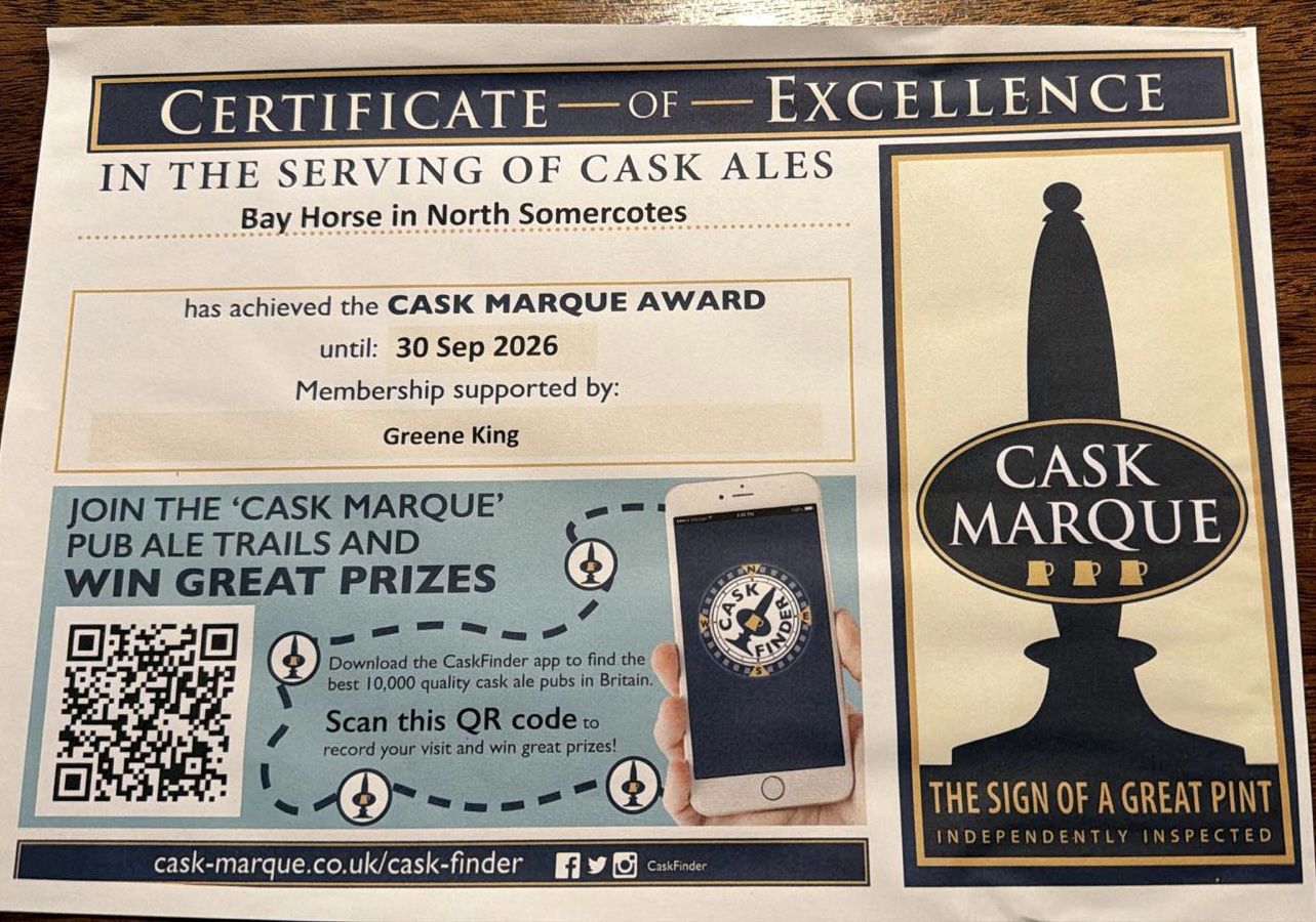 Our bar is well stocked and features 3 or 4 Cask Marque accredited ales, all perfectly-kept by our brilliant cellar staff. You are assured of a great pint with a good choice of 2 permanent ales and 1 or 2 rotating ales. See our latest Cask Marque inspection click here